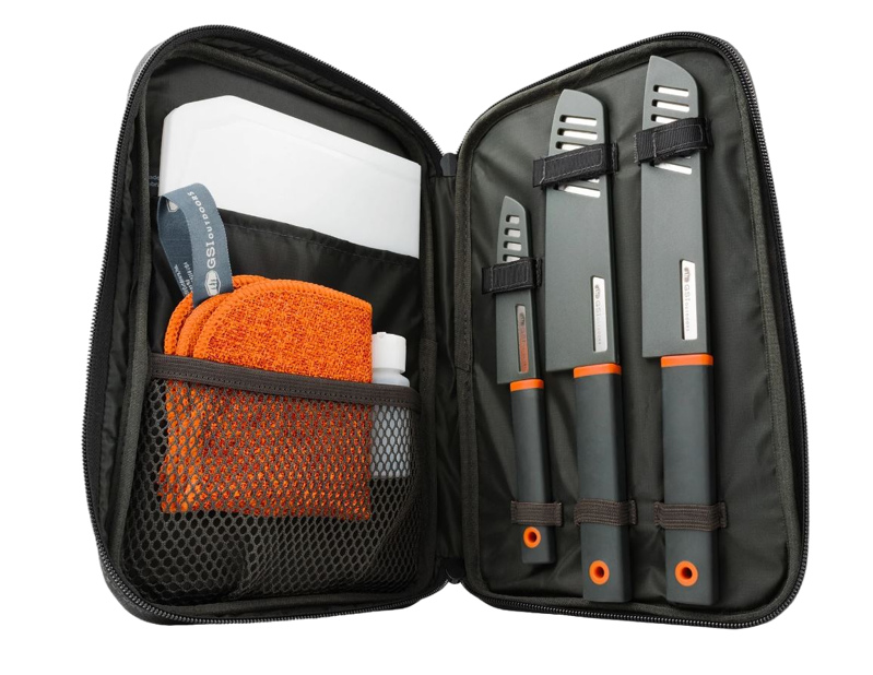 Met de GSI Santoku Messenset heb je alles bij de hand voor een volwaardige buitenkeuken. De set bevat een schilmes, Santoku-koksmes en gekarteld broodmes, elk met een beschermende schede voor veilig transport. Daarnaast krijg je een opvouwbaar snijplankje, zeepfles, vaatdoek en een stevig ballistisch nylon etui om alles compact en georganiseerd mee te nemen. Perfect voor kamperen, campertrips of outdoor koken.
