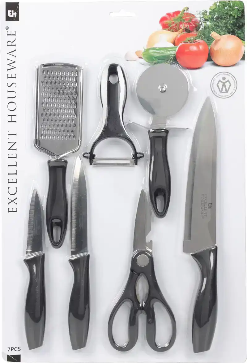 De Excellent Houseware Messenset (7-delig) is klaar voor elke snijklus. Van groente tot brood, je hebt altijd het juiste mes bij de hand. De ergonomische handgrepen zorgen voor een stevige grip. Ideaal voor koken thuis of op de camping. Zo snijd je snel, veilig en met plezier!