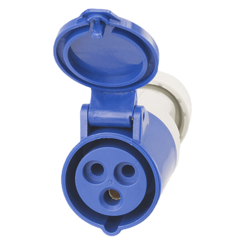 De welbekende 'caravanstekker', de 3-polige CEE Contra-stekker. Maar je gebruikt hem natuurlijk ook net zo makkelijk op je camper of boot. Spatwaterdicht.