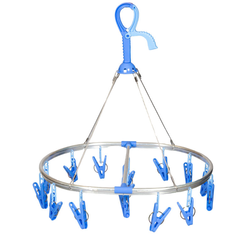 Deze blauwe droogcarrousel van aluminium is licht, stevig en perfect voor onderweg. Met 15 knijpers hang je al je kleine was makkelijk op.