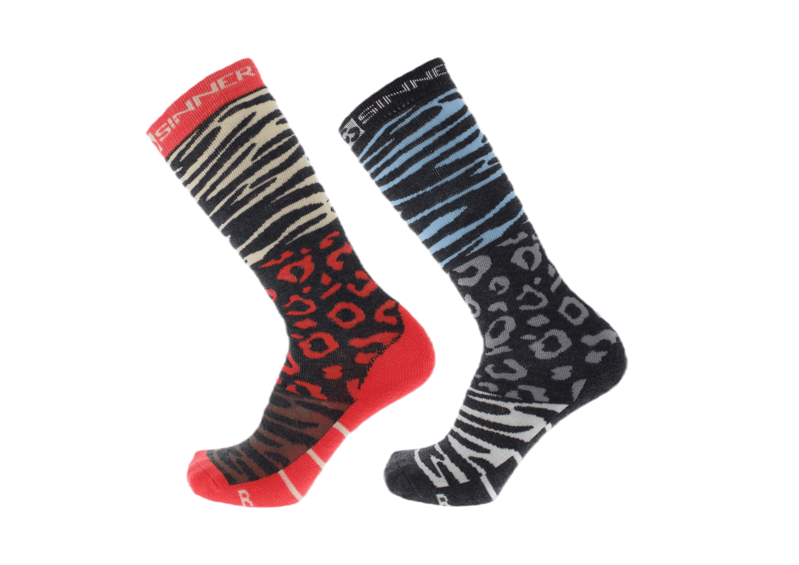Ergonomisch vormgegeven skisokken van Sinner met supergave tijger- en luipaardprint. Gemaakt van een lichtgewicht en ademende synthetische stoffenmix die vocht actief wegdrijft van de voeten. Duopack in de kleuren koraal en turquoise.